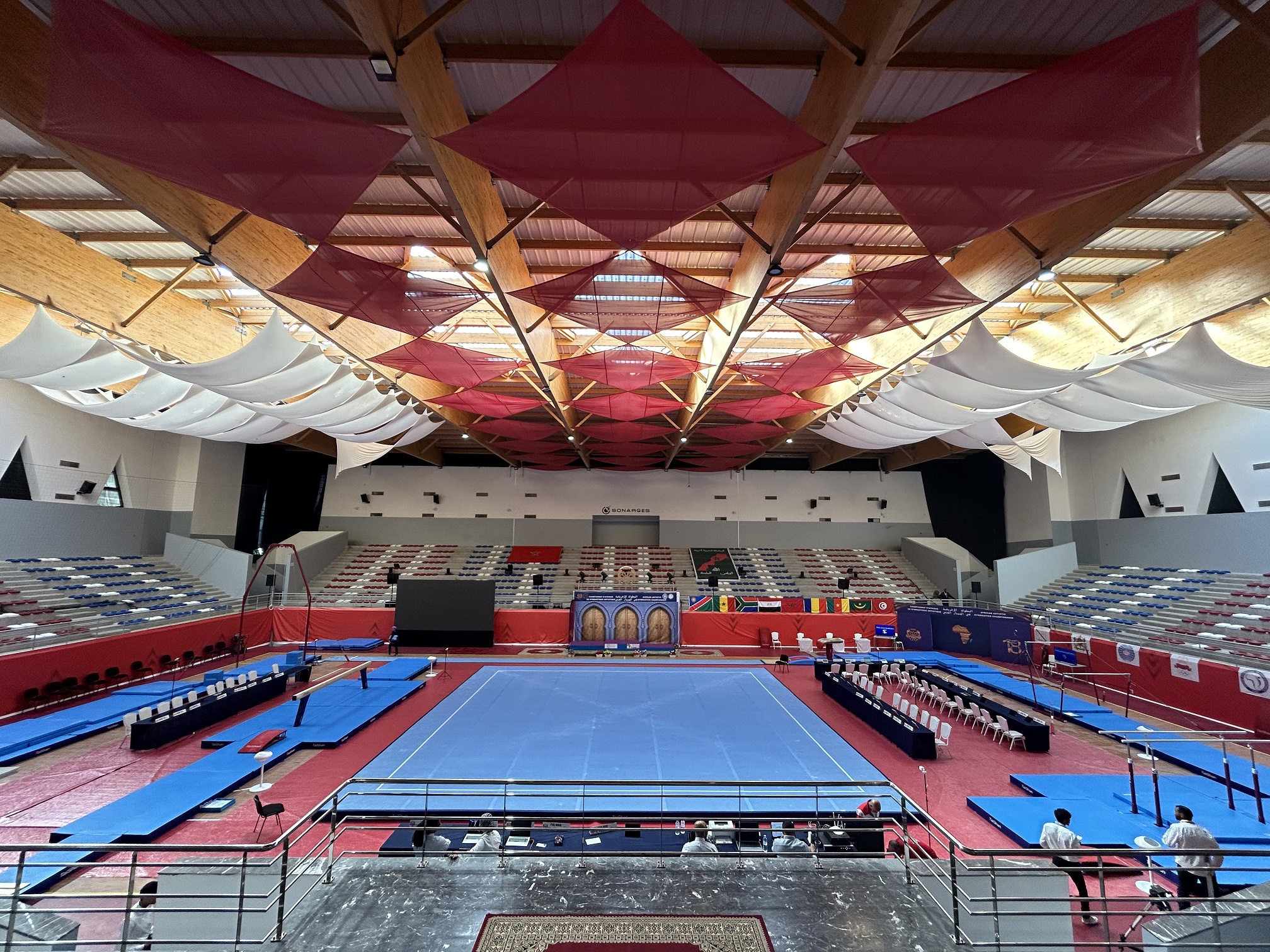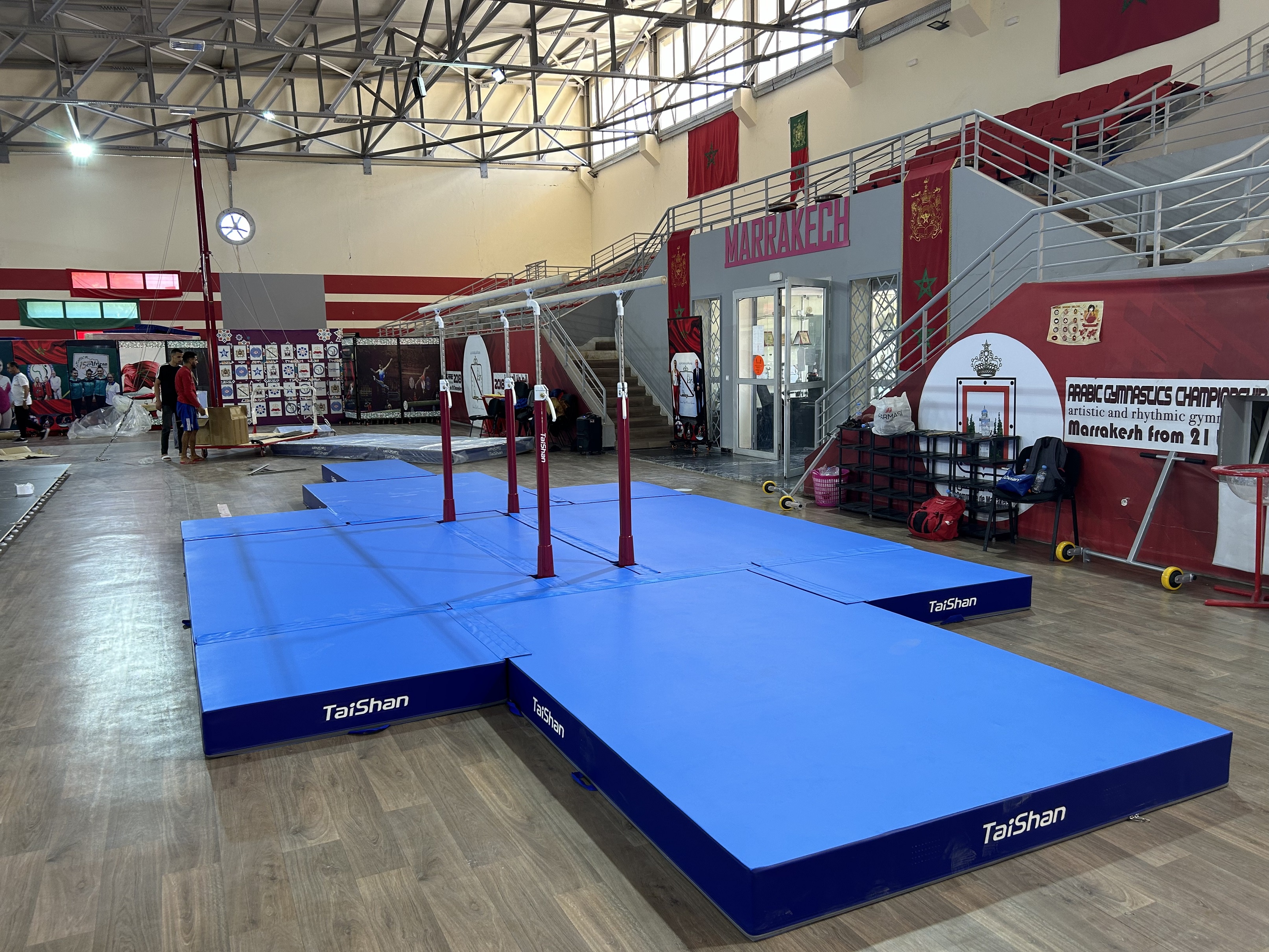 In order to ensure the excellent performance of gymnasts, Taishan Sports’ professional service team went to Marrakech to prepare for the installation and debugging of the competition venues.
