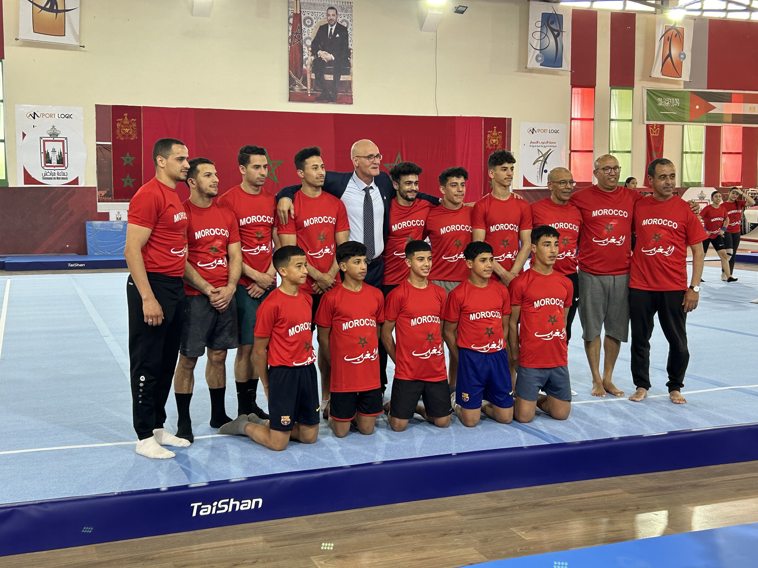 Taishan Sports will provide equipment including the B-type floor, rings, vault, parallel bars, uneven bars, as well as carbon fiber pommel horse, horizontal bar, and balance beam for the event. The President of the Moroccan Gymnastics Association visited the venue to inspect the equipment setup and gave positive feedback on our products and services. We are proud to support this event and receive recognition for our contributions.