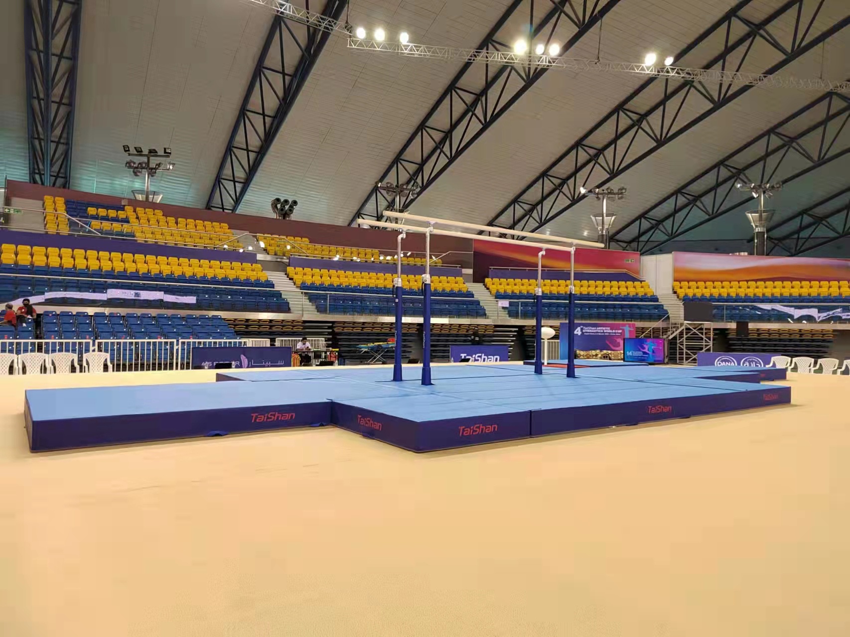 为保障运动健儿的出色发挥,中国·3003新葡体育派出了经验丰富的专业服务团队,于2月22日出发,到达多哈后,队员们不辞辛劳,马上投入到技术指导和安装工作中,并按计划于2月28日圆满完成男子训练馆、女子训练馆、竞赛馆等场馆的安装、调试工作。